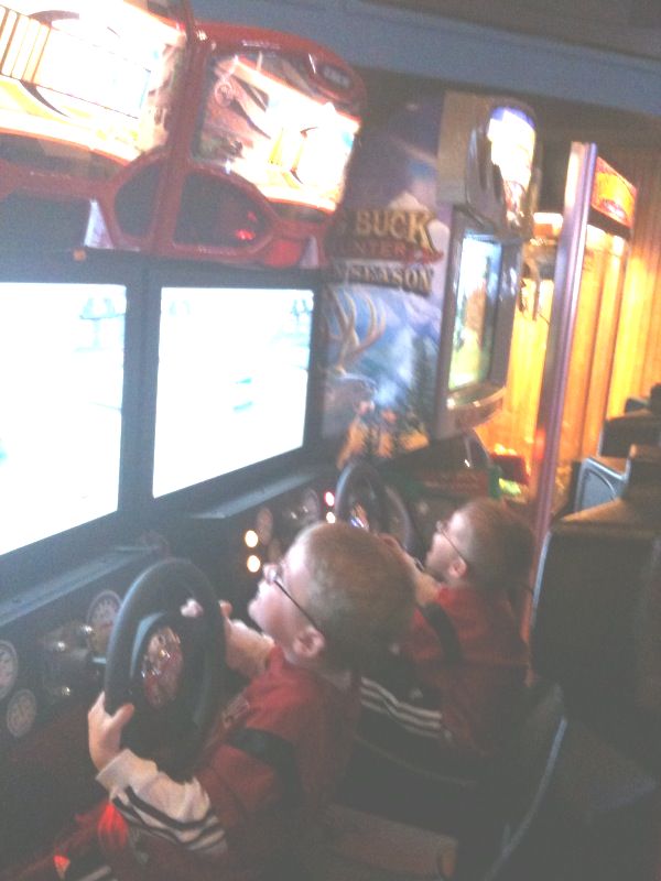 Against my better judgment and my own free will (Mad Dog is very persuasive), we took the boys to Box Seats after lunch. It actually wasn’t as overwhelming as usual. The place was pretty dead and almost serenely quiet. The boys had unlimited access to the newly installed NASCAR racing games, and Mad Dog and I shared cocktails and some actual conversation.
