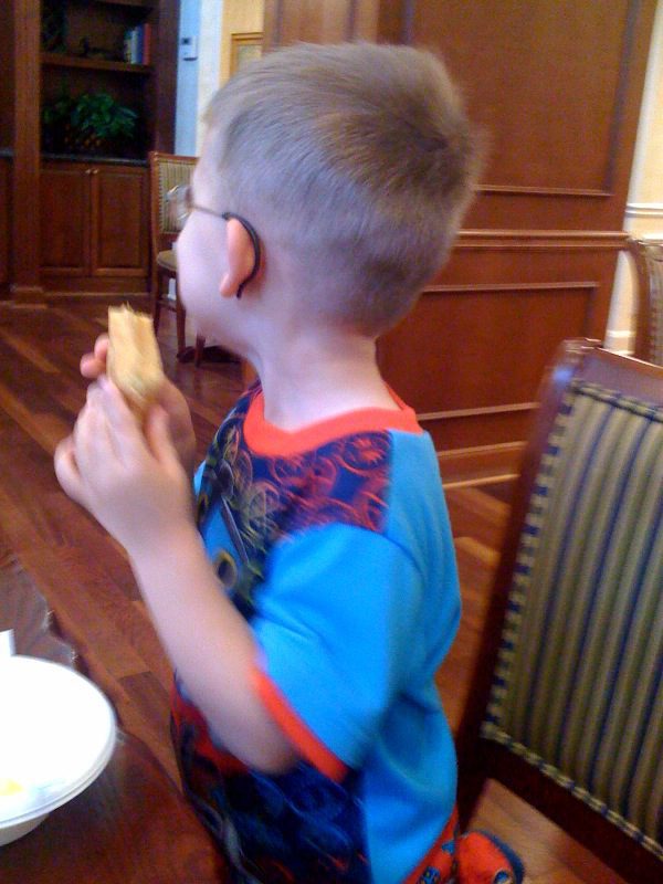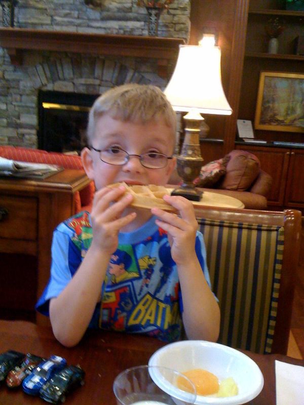 We broke up our nine hour drive and stopped at a hotel in South Carolina. There was a pull-out bed for the boys across the room from our bed. It was late enough that the boys should have been sleeping but not late enough for Mad Dog and myself to turn in for the night. My remedy for this was simple. I approached their bed and told them that in order to get a fancy breakfast in the hotel lobby (which was included in the room price) they had to be quiet. One peep out of them and they would lose this amazing privilege.