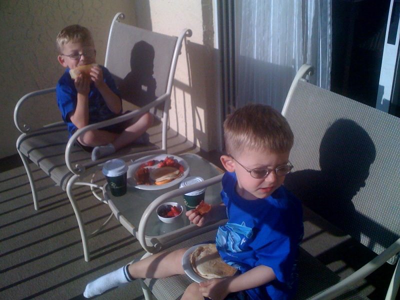So, now we are wrapping up our family vacation adventure. We started our day off with a room-service breakfast which the boys ate out on the balcony. Yum!