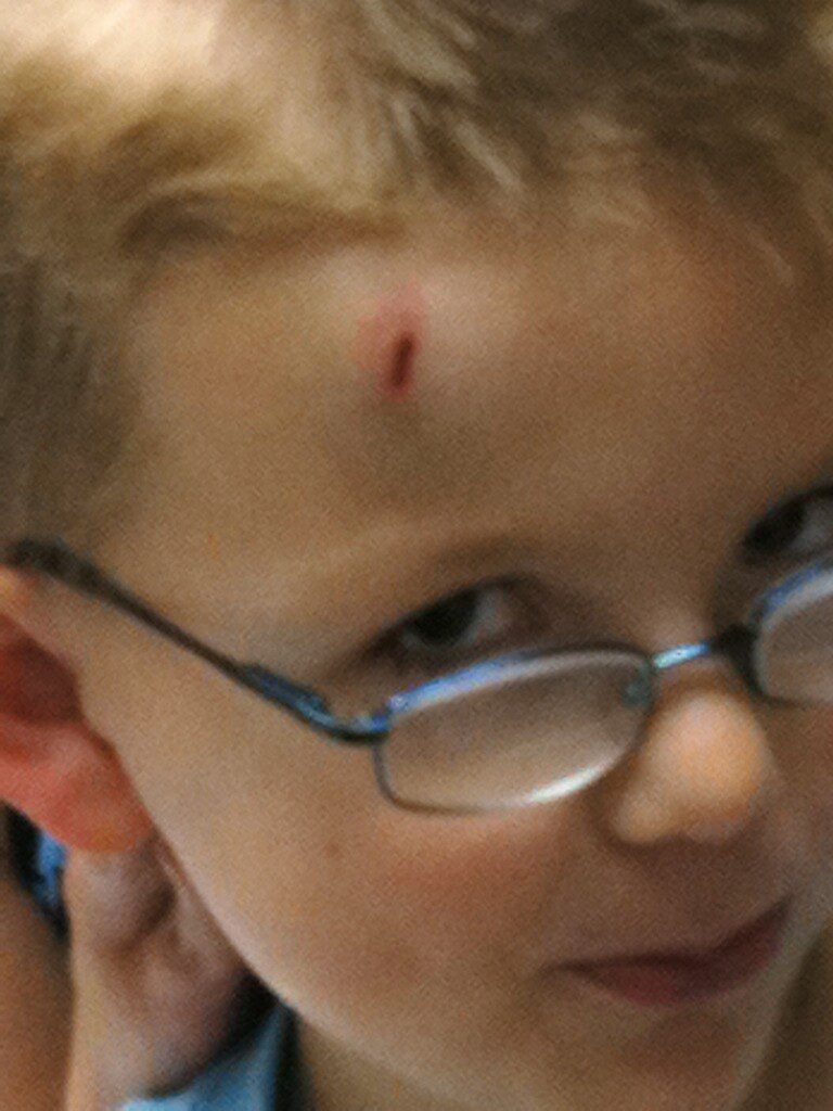 His head hits the edge of the door with a sick thud, he drops to the floor and starts screaming. I take one look at the bulging, bloodied mass forming on his forehead and nearly vomit (seriously!). You could actually see his blood pulsing furiously through the huge, goose-egged bump.