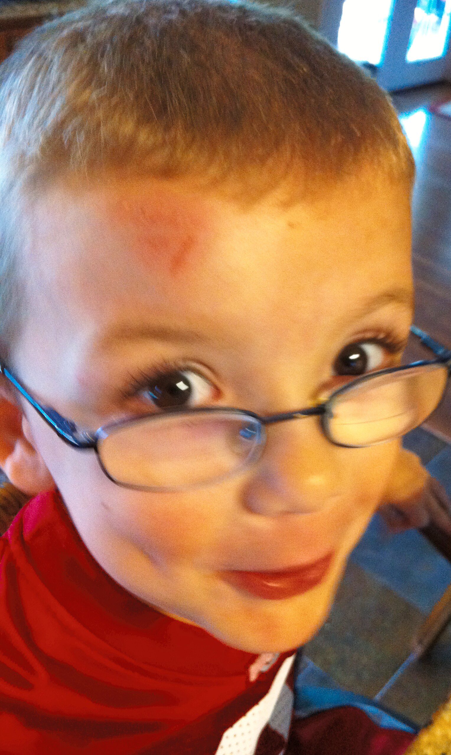 Ten minutes before our guests arrive Full Speed does a swan dive off the couch onto our hardwoood floor. Through his screams of pain Mad Dog was able to triage his damaged noggin. And wouldn’t you know it, Full Speed managed to land on precisely the same spot that had been the reason for a July trip to the emergency room.