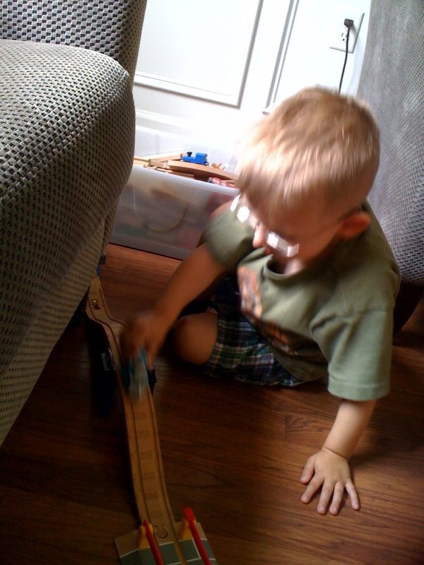 This second picture shows that even though he craves independence, he doesn’t ever like to be left alone even if I’m only in the next room. On the days it’s the two of us, he follows me from room to room about 90% of our day. Here he is playing with his beloved Thomas the Train at my feet while I blog. He knows enough to leave Mommy alone when she’s typing but there are times he still manages to put his feet (yes, his feet not his hands) or his Thomas the Train on the keyboard just to make sure Mommy is paying attention.